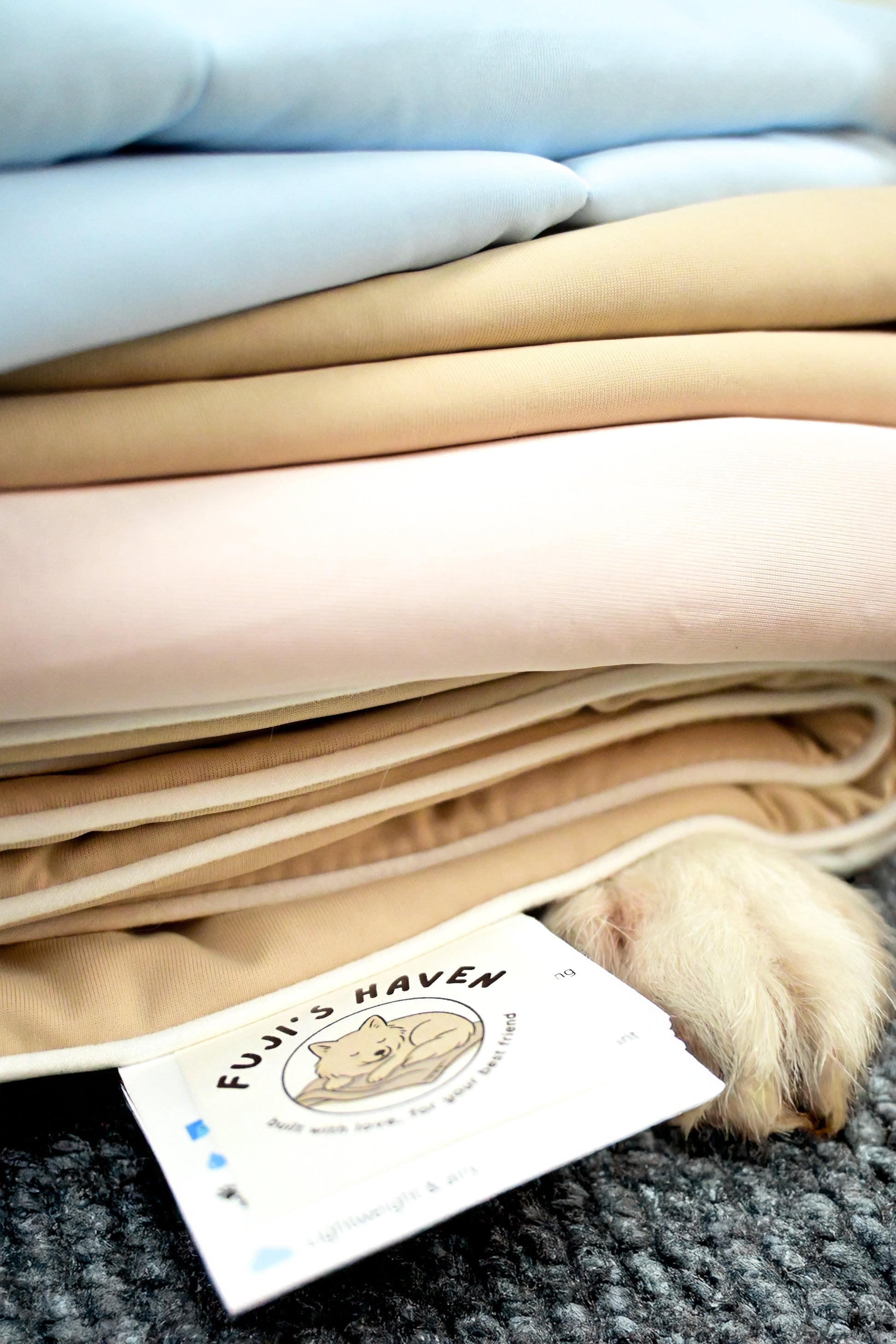 This cooling dog blanket is a game changer for hot days! It’s super lightweight, both of my pommies can lounge on it comfortably without feeling weighed down. Sometimes we fold it into a pillow for her to rest comfortably as well. The pastel colours are so pretty - it looks great in any room and makes nap time extra cosy. Definitely a must-have for sunny weather like Singapore!